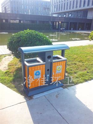 戶外鋼木分類垃圾桶,外形尺寸:1040/400/1000mm,整體板材采用實際厚度1.0鍍鋅鋼板制作而成,兩側(cè)立柱為1.5厚鍍鋅鋼管,外表做高溫噴塑處理使其外表色澤鮮艷美觀、防腐蝕能力更強(qiáng)等優(yōu)點(diǎn)。木材采用進(jìn)口樟子松經(jīng)過防腐、打磨、噴漆處理,外表美觀光滑,木材與桶體